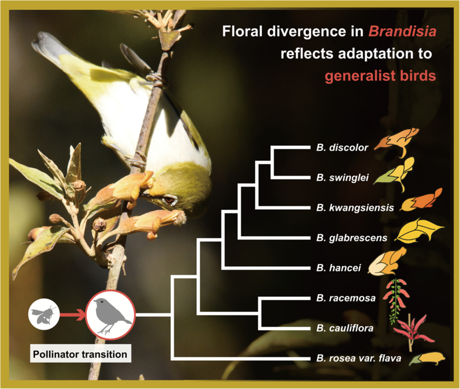 Pollinators are key drivers of floral evolution and diversification. While floral traits often converge in response to shared pollinators, they may diverge following pollinator shifts. Here, we examine the evolution of floral traits in Brandisia, a hemiparasitic genus endemic to East and Southeast Asia that shows notable interspecific variation. We combined field observations, a literature survey of pollination systems across Orobanchaceae, measurements of 14 floral traits, and phylogenetically informed comparative analyses. Our results show that Brandisia species are primarily bird-pollinated, probably derived from the bee-pollinated condition predominant in Orobanchaceae. Their flowers show typical bird-pollination traits, including tubular corollas, exserted reproductive organs, and abundant dilute nectar. Several traits may also function to avoid antagonists through visual (e.g., red coloration inconspicuous to bees), morphological (e.g., reduced or recurved corolla lobes), or physiological (e.g., dilute nectar) barriers. Ancestral state reconstruction indicates that the common ancestor of Brandisia had moderately specialized floral traits, including solitary axillary flowers, orange-yellow coloration, short tubular corollas, and hexose-dominated nectar. From this ancestral condition, both more specialized and more generalized phenotypes evolved, involving 11 shifts across eight traits. Together, our findings indicate that Brandisia is predominantly bird-pollinated in the Asian flora. Rather than resulting from major pollinator shifts, floral trait variation in Brandisia reflects a continuum of adaptation to bird pollinators, potentially shaped by fine-scale niche partitioning. Some floral traits may also have evolved under additional selective pressures, such as avoiding bees. This study advances understanding of how bird pollinators shape floral diversification in angiosperm.