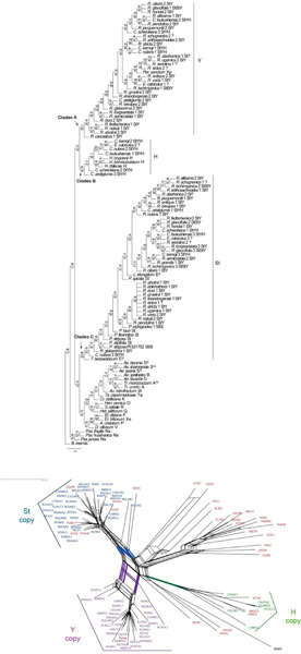 The genus Elymus L. in the tribe Triticeae (Poaceae) includes economically and ecologically important forage grasses. The genus contains the pivotal St genome from Pseudoroegneria in combination with other genomes in the tribe. Many Elymus species are tetraploids containing the StY genomes. It is thought that polyploidization characterizes the speciation of the genus in which the Y is considered as another key genome. Based on data from cytological, genome in situ hybridization, and molecular studies, we hypothesized an endo-allopolyploidy origin of the StY-genome species from the autotetraploid Pseudoroegneria species. To test this hypothesis, we amplified, cloned, and sequenced five single-copy nuclear genes (i.e., alcohol dehydrogenase 1–3, Adh1–Adh3, RNA polymerase II, Rpb2; and Waxy) from Elymus, Pseudoroegneria, and Hordeum species. The phylogenetic trees constructed based on the sequencing analyses of all genes indicated that diploid and autotetraploid Pseudoroegneria species were closely related, although with considerable genetic variation in tetraploids. In addition, the StY-genome Elymus species tended to have a close relationship with the diploid and autotetraploid Pseudoroegneria species, although different phylogenetic relationships among the gene trees were detected. These results indicated that the StY-genome species may have an autotetraploid origin and experienced recurrent hybridization. The complex St genomes in Pseudoroegneria in the polyploid state may gain more opportunities for within-species differentiation and recurrent hybridization. As a result, series modified versions of St genomes evolved into the StY genomes in some Elymus species.