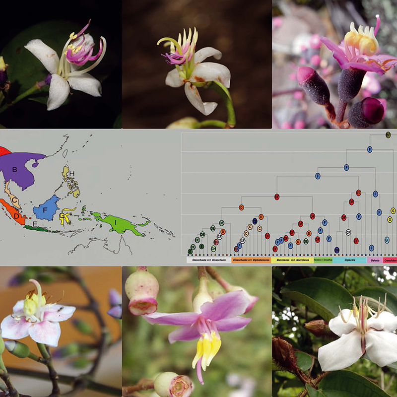 The region of Tropical Southeast Asia and the Malay Archipelago is a very appealing area for research due to its outstanding biodiversity, being one of the most species-rich areas in the world with high levels of endemism, and due to its complex geological history. The high number of species in tribe Dissochaeteae (Melastomataceae) and their tendency to narrow endemism make the tribe an ideal group for examining biogeographic patterns. We sampled 58 accessions spread over 42 accepted and two undescribed species of the Dissochaeteae. Two nuclear (ETS, ITS) and four chloroplast regions (ndhF, psbK-psbL, rbcL, rpl16) were used for divergence time estimation and ancestral area reconstruction. Results from the molecular dating analysis suggest that the diversity of Dissochaeteae in the Southeast Asian region resulted from a South American ancestor in the late Eocene. The ancestor of the Dissochaeteae might have migrated from South America to Southeast Asia via North America and then entered Eurasia over the North Atlantic land bridge during the Eocene. The origin and early diversification of the Dissochaeteae in Southeast Asia dates back to the middle Oligocene, and most of the genera originated during the Miocene. Indochina and Borneo are most likely the area of origin for the most recent common ancestor of the Dissochaeteae and for many of the early diverging clades of some genera within Southeast Asia.