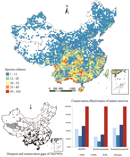 This study identified hotspots for priority conservation and conservation gaps of national key protected wild plants (NKPWPs) based on species richness, weighted range size rarity and a complementarity-based analysis. The protected proportion of plants with first-level protection is lower than that with second-level protection, and the low proportion of protected hotspots indicates that the conservation status of NKPWPs is not optimistic.